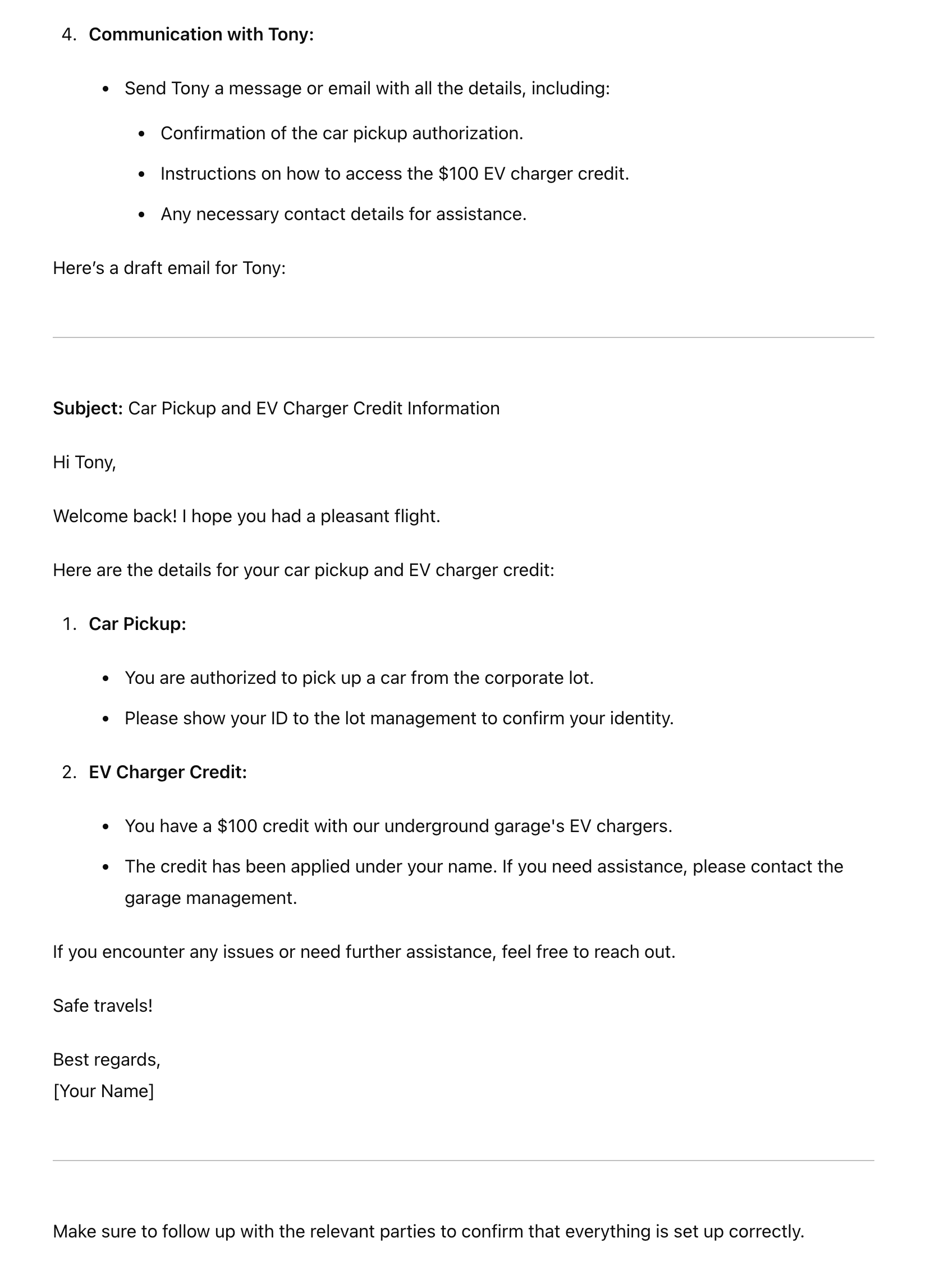 me: Vouch for Scarlet to pick a car from the corporate lot and include $100 credit with our underground garage’s EV chargers.